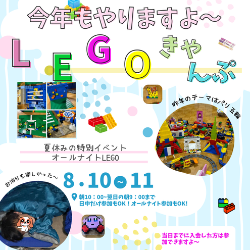 皆で一日中LEGO三昧をして、皆で夕食を食べ、寝るまでゲームをしたり、LEGOしたり、お話したり自由に楽しめる2日間をご用意しています。